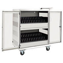 Heavy duty steel construction with locking doors for security. This cabinet charges and syncs up to 16 devices via USB cable. Includes adjustable dividers for different sized devices, 2.4 amps of charging power and can be mounted to the wall, counter top or floor for added security and flexibility.